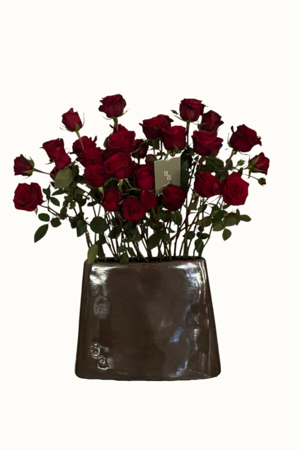Nothing says “I’m thinking of you” like this sweet combination of deep red roses and chocolatey ceramic. The stems are left long and playful for a natural, “just picked” look. It’s a little piece of garden magic delivered right to their door