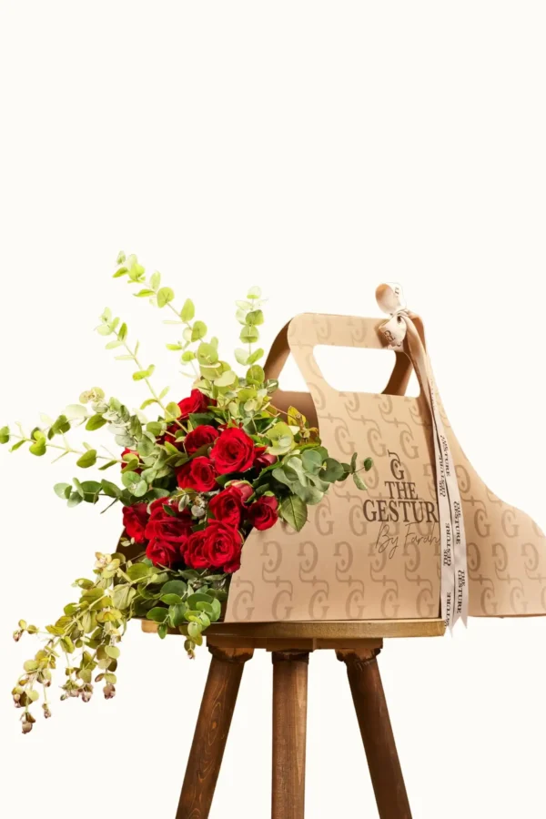 Red flowers balanced with eucalyptus, designed to feel expressive yet refined. A modern gesture that carries feeling with confidence.