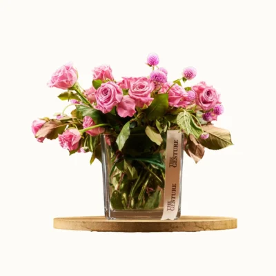 Soft pink roses and playful globe blooms, gathered in a clear glass vase. Romantic, and effortlessly elegant.