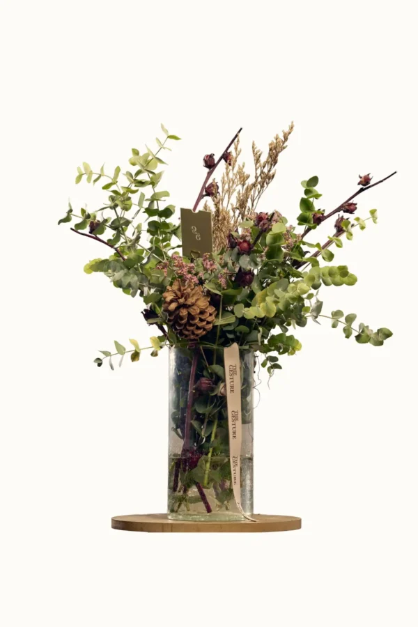 Earthy greens and rustic textures, gathered in a clear glass vase. Natural, and effortlessly elegant.